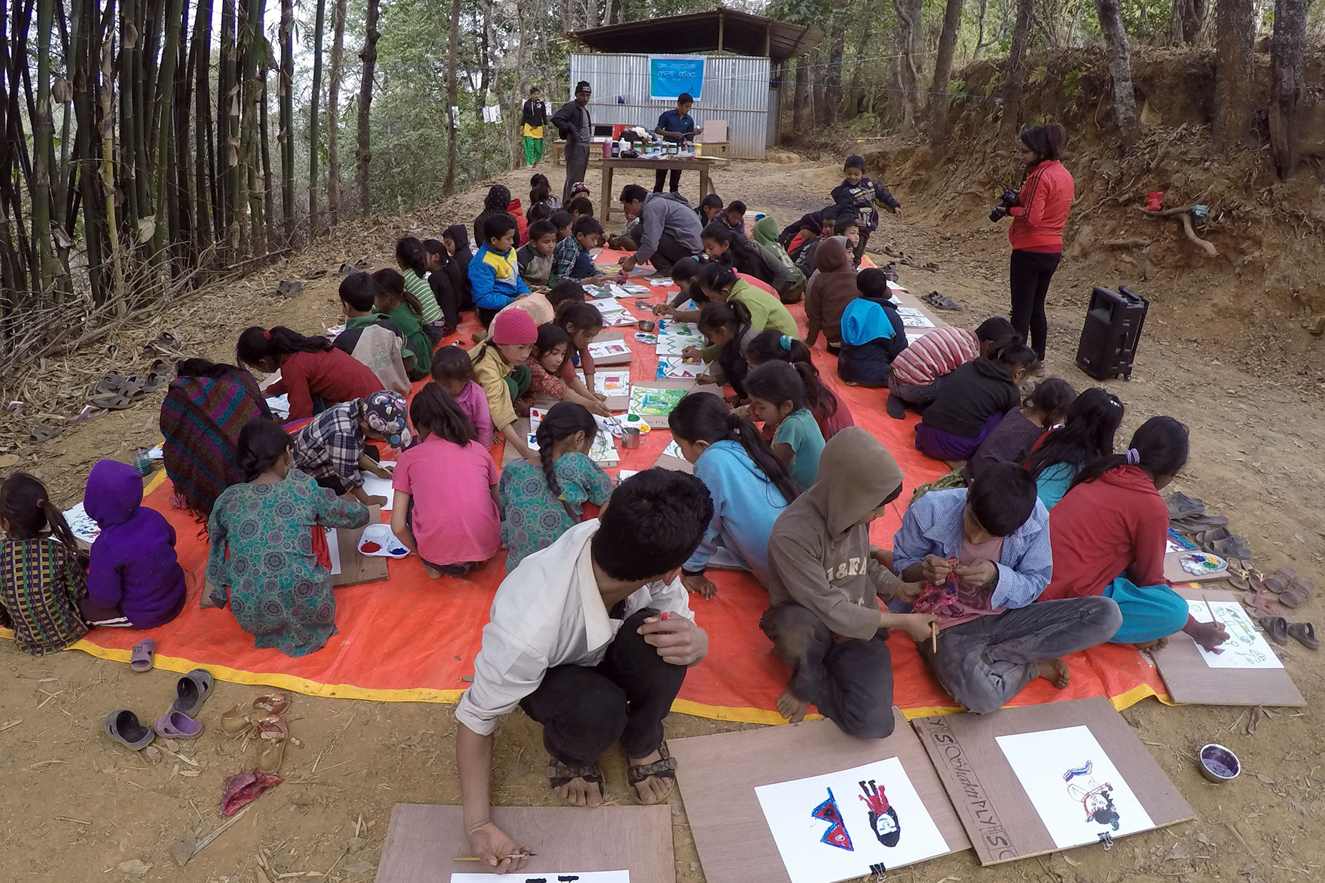 Kailash Shrestha, co-founder of Artudio Center for Contemporary Visual Arts, is from Gairimudi, a village located in Dolakha district, which was the epicentre of the second major earthquake on 12 May 2015. During his visit to the village after the catastrophe, he organised a 22-day art camp, called Healing through Art, for the children in the community. Existing educational infrastructure, including school buildings, were destroyed, and the art camp therefore became a safe space for the children to engage in creative explorations.12 They were guided through a series of interactive and meditative activities, encouraged to pay attention to their environment, and given time to experiment with colour, gestures and organic materials. Some sessions were spontaneous, inviting children to interact with their surroundings and transform them into imaginative landscapes, which were used as an entry point to process traumatic experiences and emotions following the disaster.