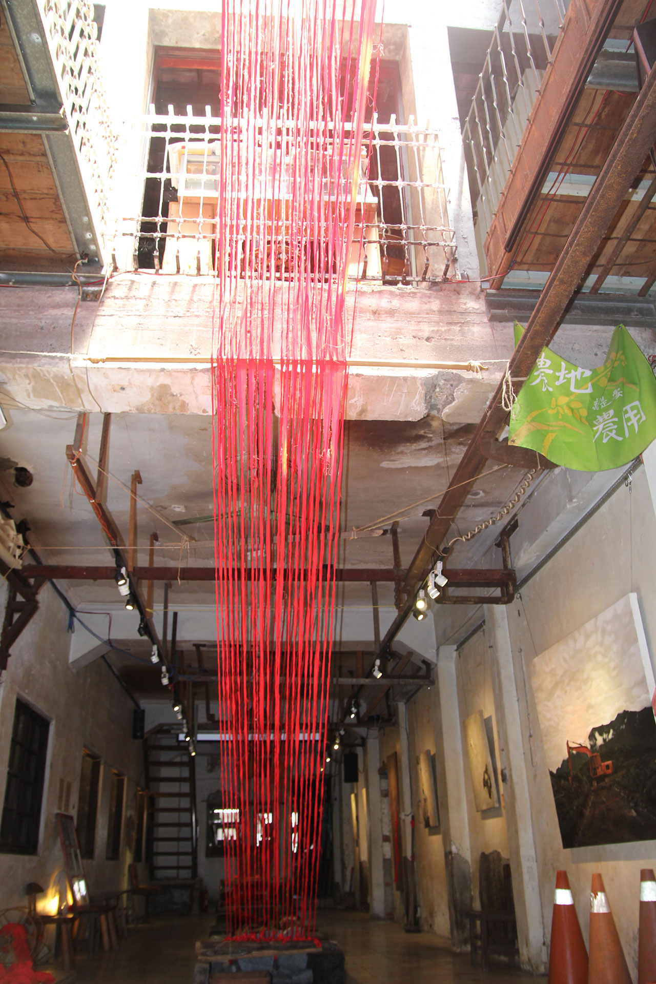 The use of red fabric relates to ideas of community and collectivity, as well as to customary weaving techniques. Looped through the remnants of burnt backstrap looms — salvaged from a Bontoc dwelling with burnt household objects — the threads hint at both the destruction and resilience of indigenous culture.